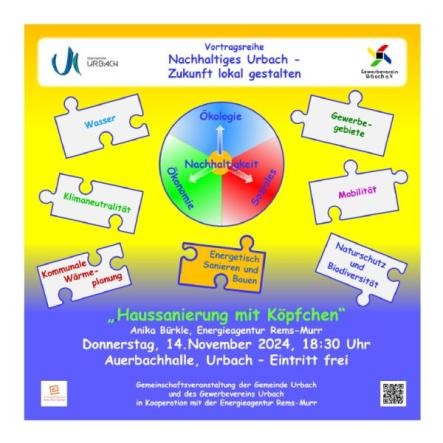 Der Vortrag ist Teil der lokalen Vortragsreihe „Nachhaltiges Urbach – Zukunft lokal gestalten“ zusammen mit dem Gewerbeverein Urbach e.V. und wird in Zusammenarbeit mit der Energieagentur Rems-Murr organisiert. Der Eintritt ist frei.