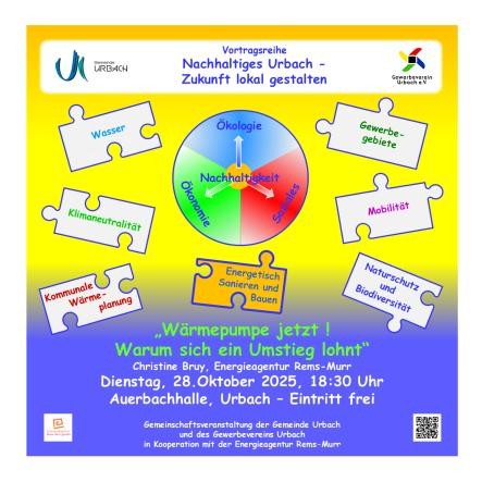 Der Vortrag richtet sich an alle, die sich mit der Anschaffung einer Wärmepumpe beschäftigen oder einen Überblick über die aktuellen Heizungstechnologien erhalten möchten. Die Gemeinde Urbach und der Gewerbeverein Urbach laden ein. Der Eintritt ist frei. Im Anschluss an den Vortrag können kostenlose Vor-Ort Beratungstermine mit der Energieagentur Rems-Murr vereinbart werden.