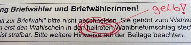 Auf dem gelben Wahlschein für die Bürgermeisterwahl ist ein redaktioneller Fehler abgedruckt. Auf der Vorderseite heißt es in dem Abschnitt „Achtung Briefwählerinnen und Briefwähler“: „[…] Dann erst den Wahlschein in den hellroten Wahlbriefumschlag stecken.“ Richtigerweise müsste dort stehen: „[…] Dann erst den Wahlschein in den gelben Wahlbriefumschlag stecken.“.
