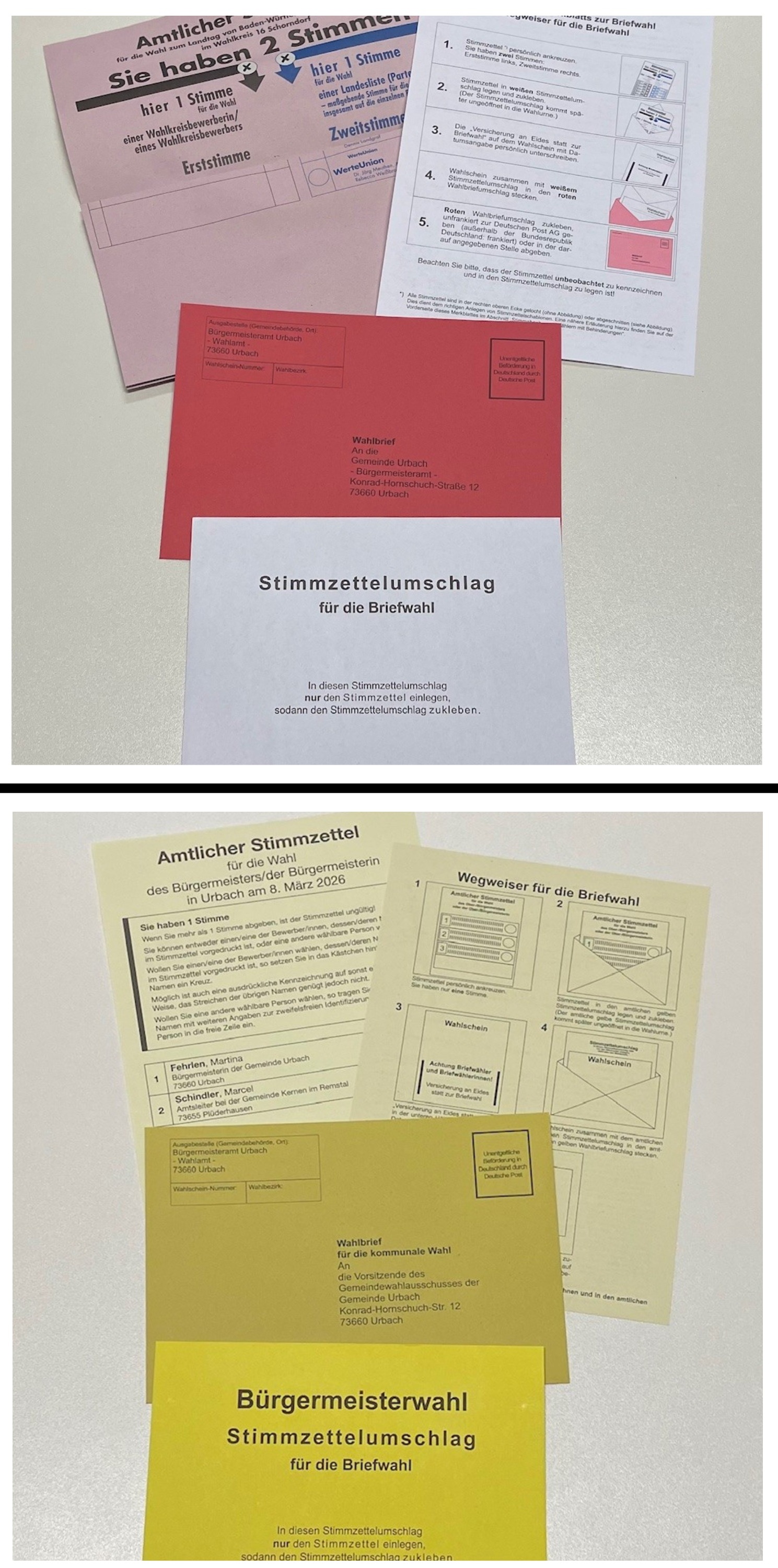 Bezüglich des Sachverhalts wurde Rücksprache mit dem Landratsamt Rems-Murr-Kreis gehalten. Es kann festgestellt werden, dass für die Zulassung von Wahlbriefen durch die Briefwahlvorstände die Farbe des Briefumschlags, in dem die Stimmzettelumschläge und die Wahlscheine transportiert wurden, keine Auswirkung hat. Am Sonntag, den 8. März 2026, werden ab 15 Uhr die Wahlbriefumschläge durch die Briefwahlvorstände geöffnet und überprüft. Sollte in einem roten Briefumschlag sowohl der gültige Wahlschein für die Bürgermeisterwahl, als auch für die Landtagswahl zusammen mit den dazugehörigen Stimmzettelumschlägen eingepackt worden sein, werden die Stimmzettelumschläge dennoch zugelassen. Gleiches gilt, wenn beide gültigen Wahlscheine und beide Stimmzettelumschläge in dem gelben Wahlbriefumschlag eingeworfen oder versendet wurden.