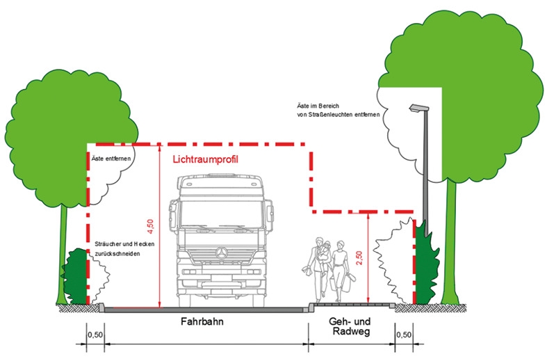 Über Geh- und Radwegen sind mindestens 2,50 Meter freizuhalten.