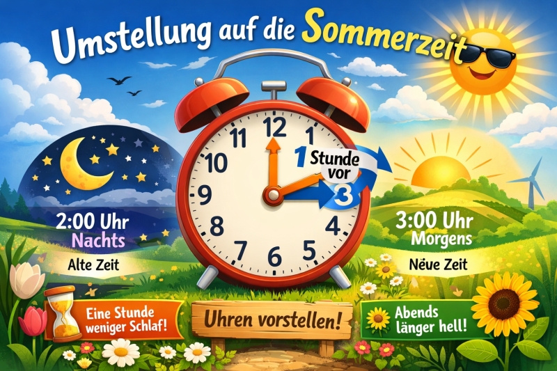 In der Nacht von Samstag auf Sonntag, 29. März 2026, wird die Uhr auf die Sommerzeit umgestellt. Die Uhren werden um 2:00 Uhr um eine Stunde auf 3:00 Uhr vorgestellt.