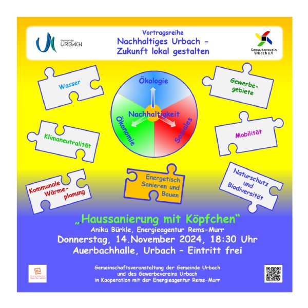 Der Vortrag ist Teil der lokalen Vortragsreihe „Nachhaltiges Urbach – Zukunft lokal gestalten“ in Zusammenarbeit mit dem Gewerbeverein Urbach e.V.